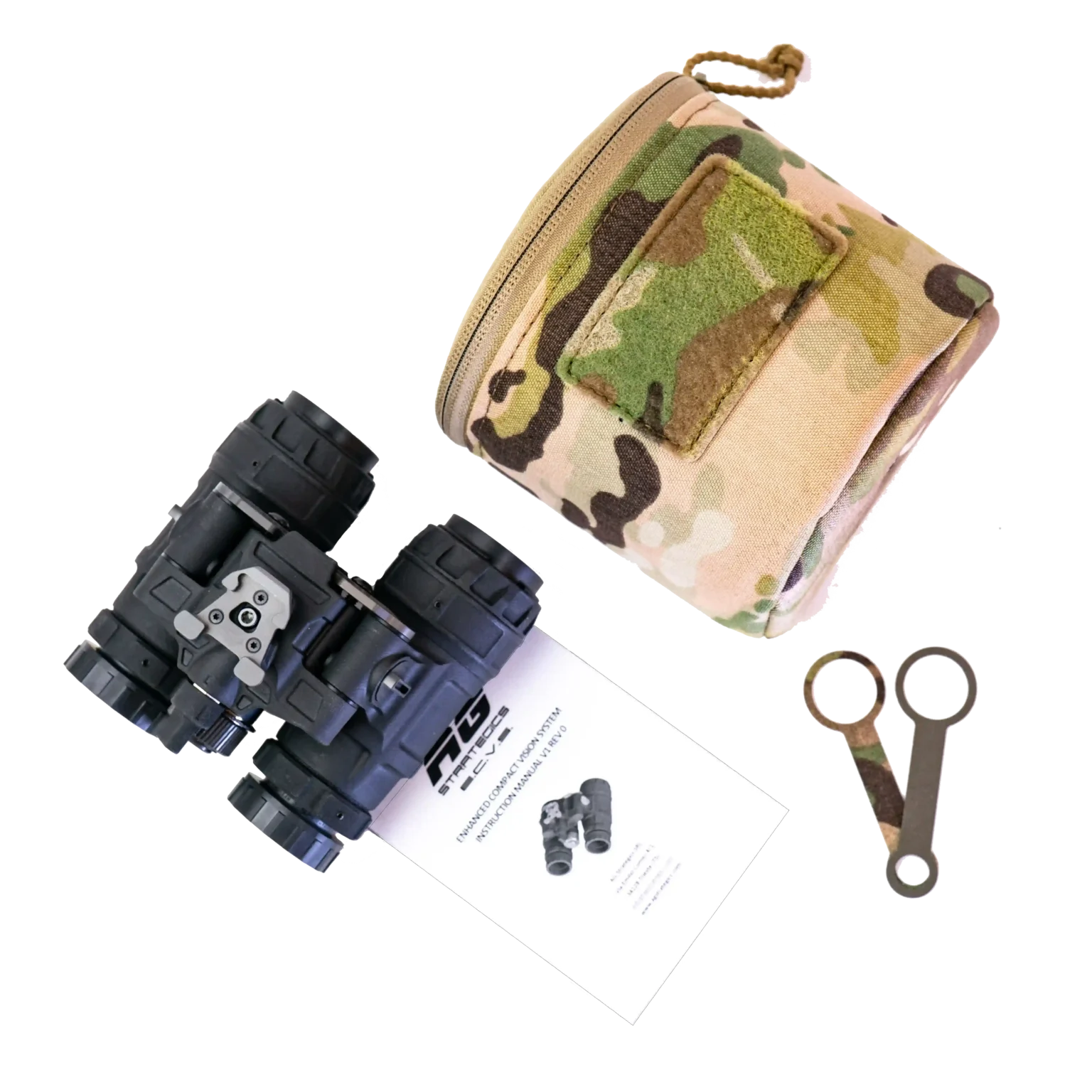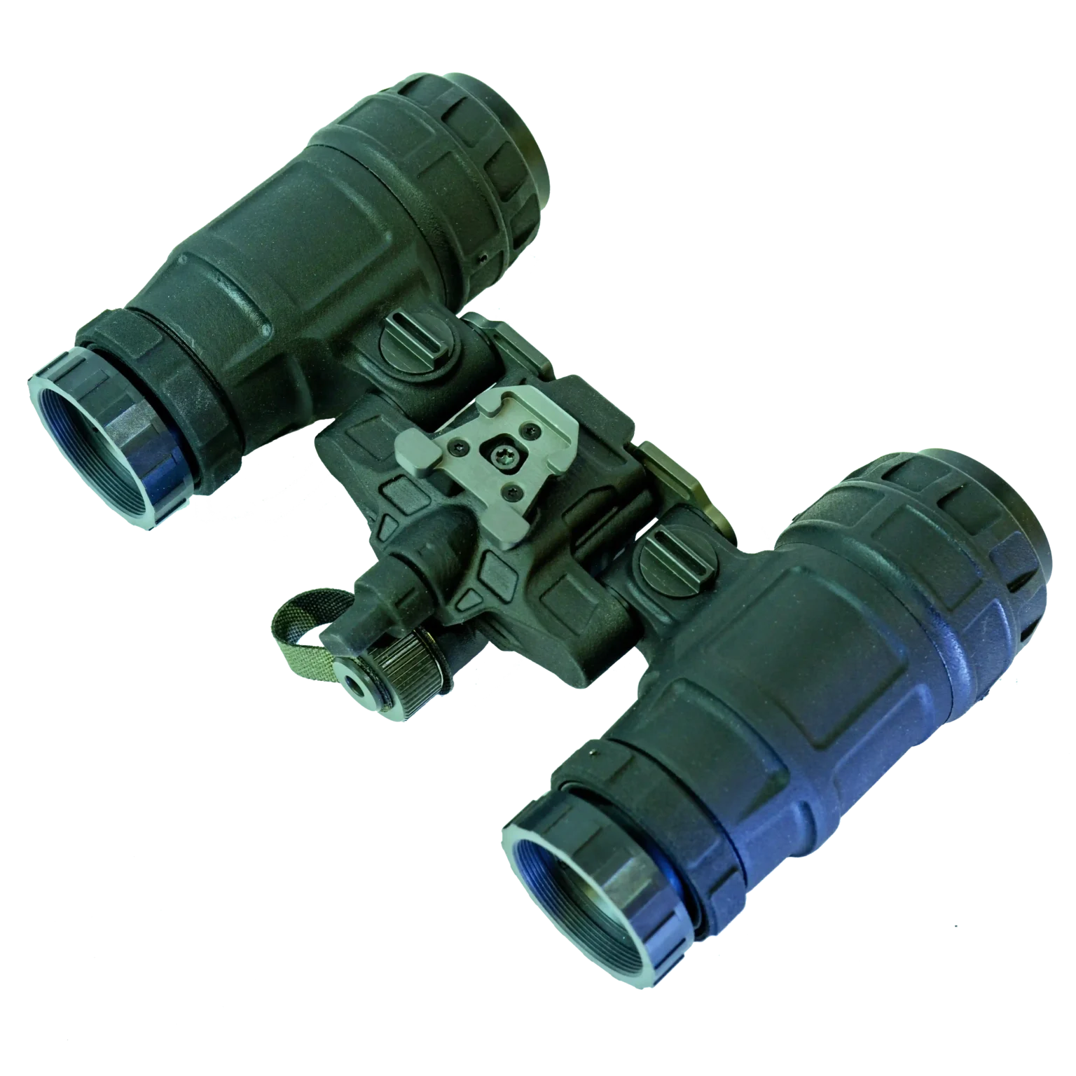 The E.C.V.S. (enhanced compact vision system) is a compact and ergonomic binocular night vision device that allows residual ambient light amplification. By residual ambient light are meant star, moon and light glow in the ir and visible spectrum.
